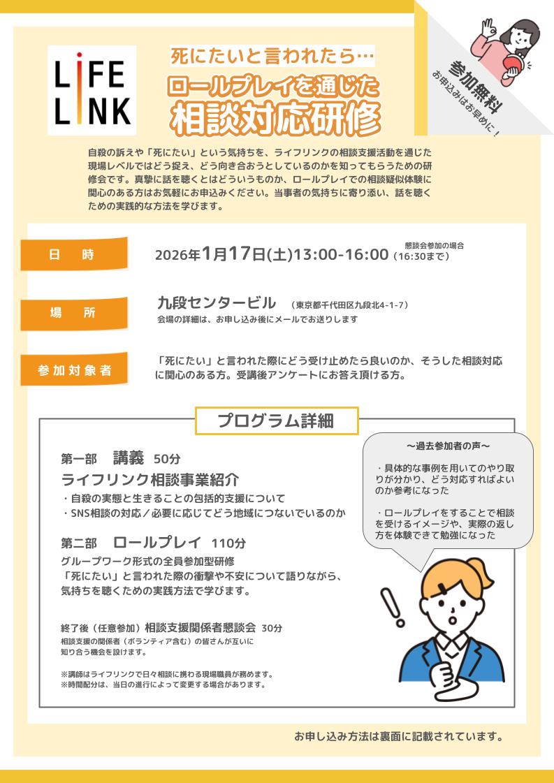 特定非営利活動法人 自殺対策支援センター ライフリンクより 「『死にたい』と言われたら。ロールプレイを通じた相談支援研修」受講者募集(無料)